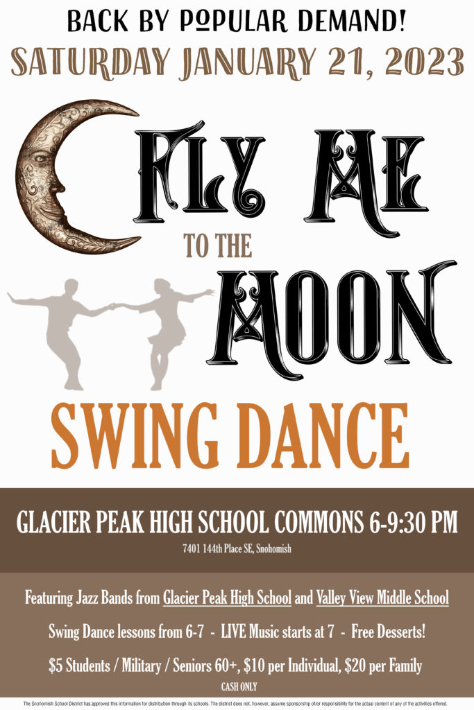 Students, parents, and the community are invited to the 2023 Glacier Peak High School “Fly Me To The Moon” swing dance. The event will start at 6:00 PM on January 21, 2023. Swing dance lessons will begin at 6:00 PM and LIVE music performed by jazz bands from Glacier Peak High School and Valley View Middle School will begin at 7:00 PM. Free deserts!